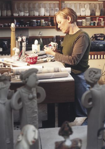 A trained psychiatric nurse, Oliver’s potting career began in 1993 when she contacted Kelvin Falconer of Rolling Cloud Pottery in Katikati for tuition with the intention of learning to make a dinner-set for her home in Whakamarama. The first piece that Oliver produced under Falconer’s guidance was a dinner plate. She never finished the dinner-set, but having fallen in love with the medium, she moved quickly on from the wheel to master hand-building techniques, first producing a series of clocks before beginning to create the quirky characters that became idiosyncratic of her practice. Her works reflect the complexities of the human condition, whilst remaining accessible and light-hearted through the use of humour, and are popular with local, national and international collectors.